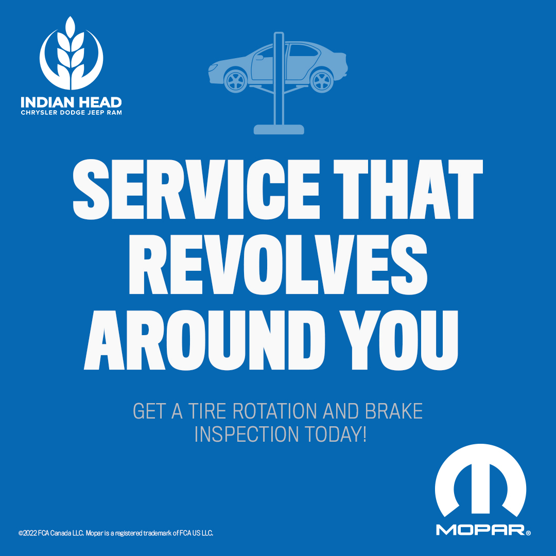 Proper tire and brake maintenance plays a key role in your vehicle’s safety and performance. At Indian Head Chrysler Dodge Jeep Ram Ltd. in Indian Head, SK, our service team provides professional tire rotations and brake inspections to help promote even tire wear, responsive braking, and confident driving year-round. Contact our Service Department to schedule a tire rotation and brake inspection.