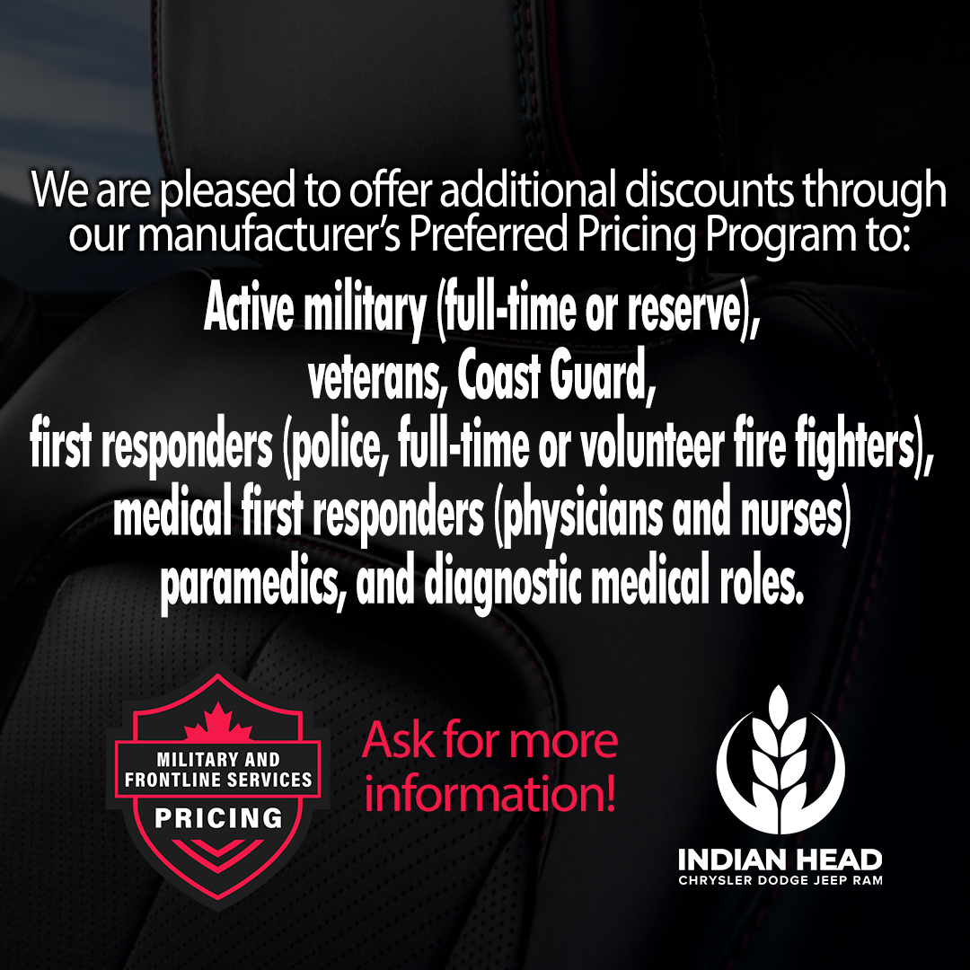 Indian Head Chrysler Dodge Jeep Ram participates in manufacturer preferred pricing programs for eligible military members, veterans, first responders, and medical professionals. Reach out for eligibility details and the documents needed to access the program.