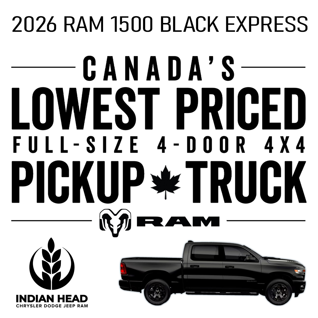 Looking for a new Ram 1500 in Saskatchewan with strong value and the features you need? The 2026 Ram 1500 Black Express is a popular choice for drivers who want capability, comfort, and a clean, bold look—without overcomplicating the buying experience. Contact Indian Head Chrysler Dodge Jeep Ram to see current availability and pricing on in-stock units.