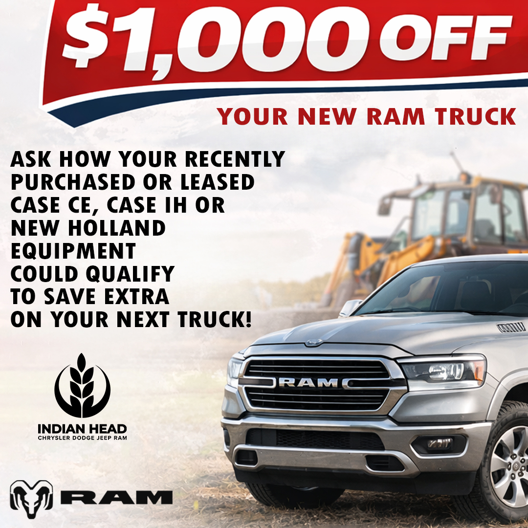 If you’ve recently purchased or leased qualifying CASE CE, CASE IH, or New Holland equipment, you may be eligible for additional savings on a new Ram truck. Indian Head Chrysler Dodge Jeep Ram can help you confirm eligibility and apply this manufacturer incentive toward your next truck purchase—so your equipment investment goes further.